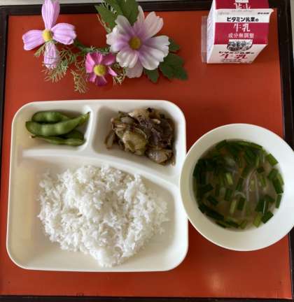 今日の給食は、プルコギ・トック・枝豆・ご飯・牛乳でした。