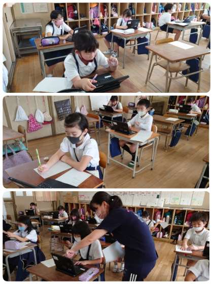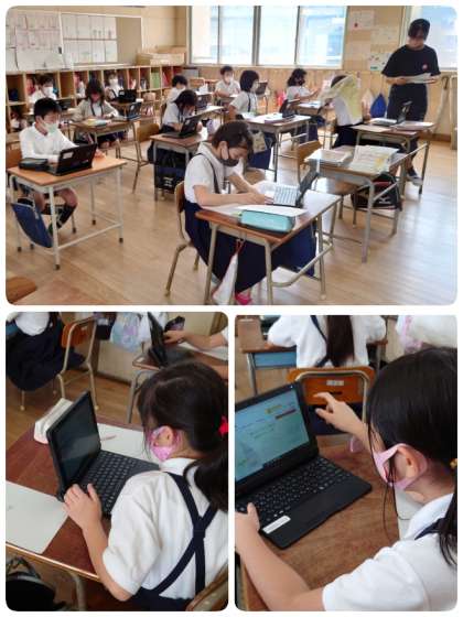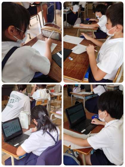 学習園のゴマの実の色が茶色になってはじけてきました。3年生は、インターネットで、ゴマの栄養分やゴマを使った料理(給食)などについて調べながら、自分で考えてプリントにまとめていました。集中して調べ学習に取り組んでいました。花丸ですね。