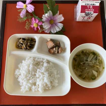 今日の給食は、鮭のしょうゆ風味焼き・五目汁・高野豆腐のいり煮・ご飯・牛乳でした。