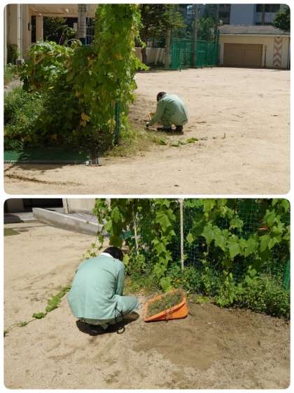 児童数が少ないので、運動場に草が生えてきてしまいます。今日も管理作業員さんが、運動場の端のほうの草を抜いてくれていました。自然の草の生きる力はすごいですね。