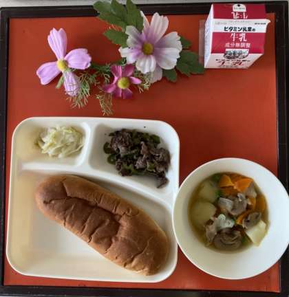 今日の給食は、牛肉の香味焼き・スープ煮・サワーキャベツ・黒糖パン・牛乳でした。