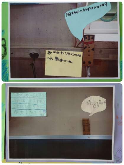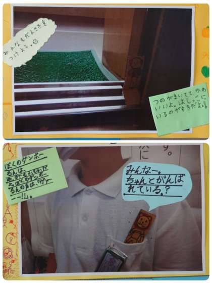 ダンボーるんと一緒に撮った写真に子ども達が考えたキャラクターの特徴とメッセージを添えました。
