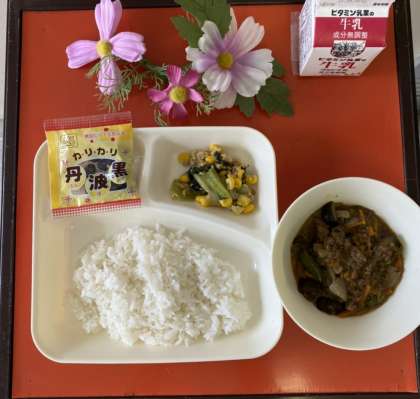 今日の給食は、マーボーなす・ツナとチンゲンサイの炒め物・いり黒豆・ご飯・牛乳でした。
