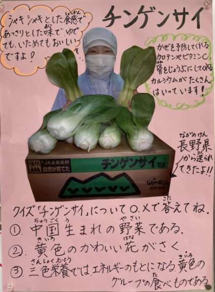 今日の副食で提供されたチンゲンサイには、風邪の予防に効果があるカロテンやビタミンCが多く含まれています。また骨や歯を丈夫にするカルシウムも多く含まれていて、これからの季節にぴったりの食材です。またご家庭の食事の一品として使用してください。