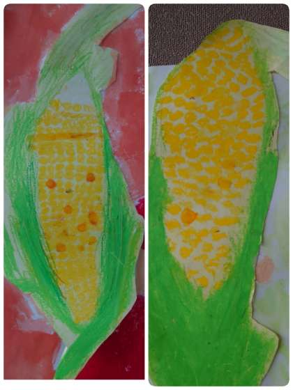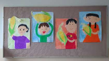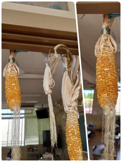 学習園で収穫したトウモロコシの絵を描きました。一粒一粒、色や形をよく見て描きました。今、教室で乾燥させています。しっかり乾かした後、何に変身するのかな?