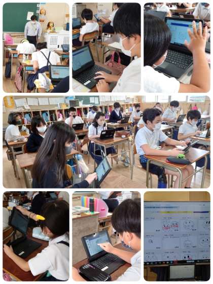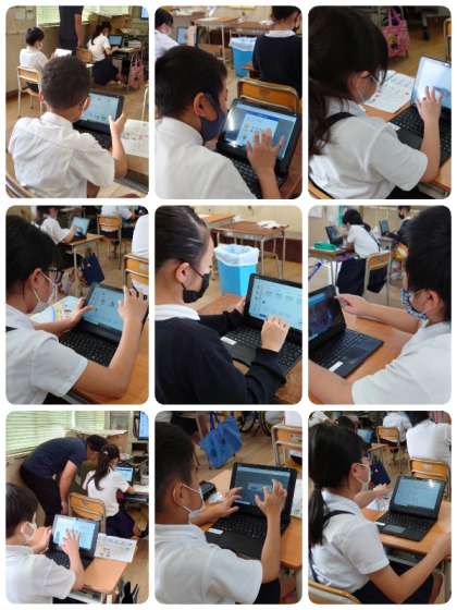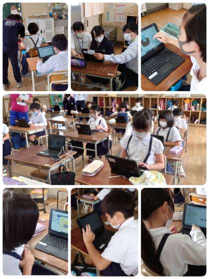 1〜4年生は国語・算数・英語のドリルに、5年生はいろいろな機能を使って学習していました。今日は5時間の日なので6年生の入り込みはありませんでしたが、6年生も日々活用していますよ。