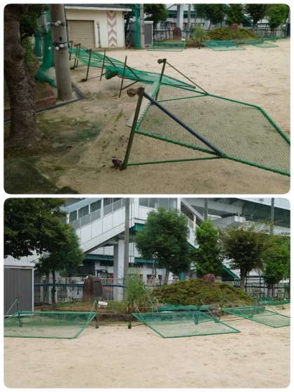 台風14号接近に備えて、朝から運動場の防球ネットやサッカーゴールを横に倒しました。みなさんも気をつけてお過ごしください。