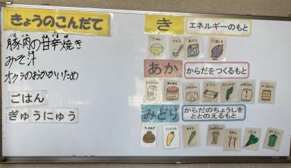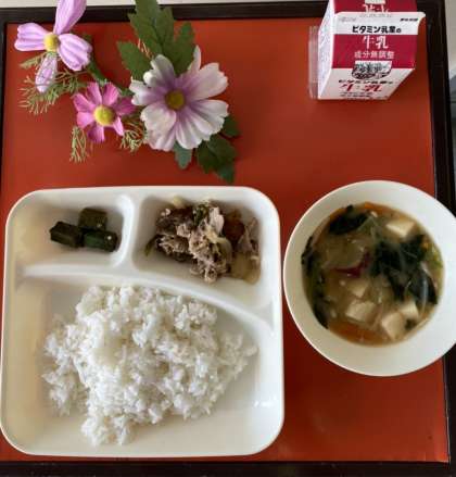 今日の給食は、豚肉の甘辛焼き・みそ汁・オクラのおかか炒め・ご飯・牛乳でした。