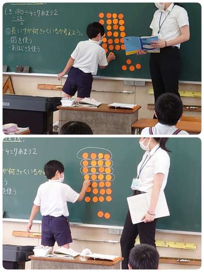 座れない2人をどうするのか○図やおはじきを使って考えました。お友達と意見交流もしました。最後はみんなが納得して、7脚+1脚=8脚になり、30人全員座ることができました。この時間、子ども達はよく考え発表もがんばっていました。花丸ですね。