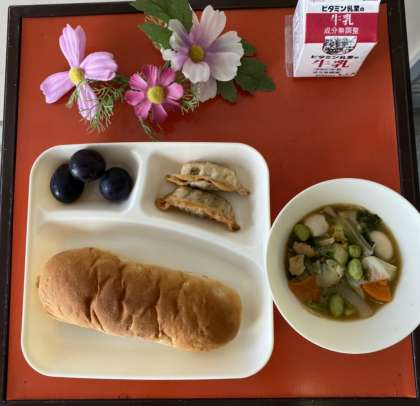 今日の給食は、あげぎょうざ・中華煮・ぶどう(巨峰)・おさつパン・牛乳でした。