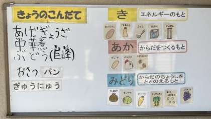 給食では季節に応じた食材を積極的に使用しています。今後、さんまやさつまいも、さといも、きのこ、くり、ぶどう、かき等が登場します。今日の献立でも、パンにはさつまいもが入っていたり、デザートでぶどう(巨峰)が出たりしていました。