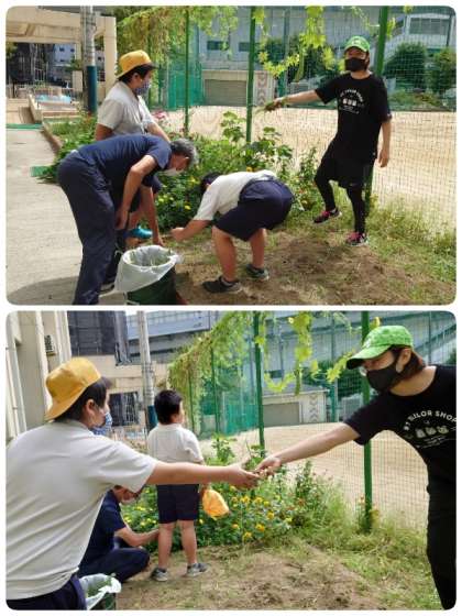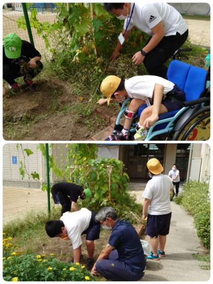 6年生の学習園の場所があいたので、なかよし学級でチューリップとラディッシュを植えることにしました。まずは草抜きから。草を抜きながら「うんとこしょ どっこいしょ」と大きなかぶの練習もしながら、みんなで協力して作業しました。