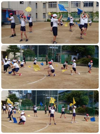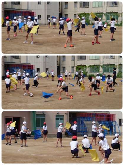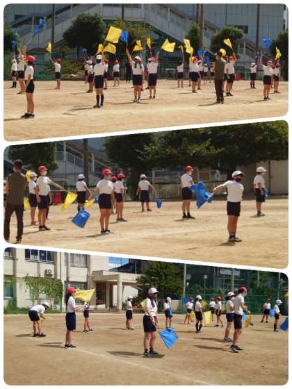 5・6年の団演は、恒例となったフラッグを使った集団演技です。初めて運動場で5・6年一緒に合わせました。号令に合わせて動きの確認です。タイミングを合わせて一斉にフラッグを振るところが一つの見せ場です。みんな真剣な表情で練習に励んでいました。これからの成長が楽しみです。