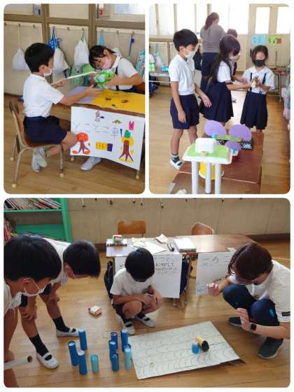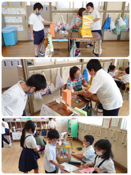 生活科の学習で2年生が作った動くおもちゃを使って、お店を開きました。お客さんは1年生。それぞれのコーナーのおもちゃはどれも楽しい工夫がいっぱい。お店屋さんの2年生も、お客さんの1年生もすごく楽しそうに活動していました。