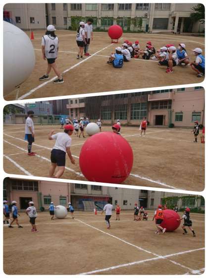 また授業の後半は、5年生がそのまま運動場に残り、団体競技である大玉転がしの練習に取り組みました。赤白それぞれに2人組でトラックを半周ずつ大玉を転がして次のペアに渡しますが、特にカーブを走る時のボール操作に苦労していました。