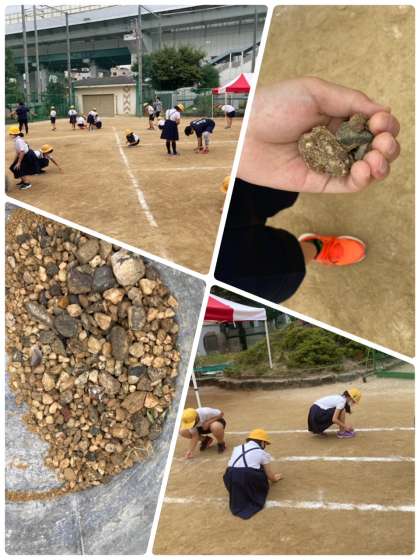 10月の校内クリーンアップ作戦は、運動場の石拾いです。班ごとにそれぞれの場所に分かれて石を拾いました。みんなで力を合わせてたくさんの石を運動場から取り除くことができました。