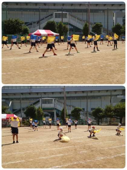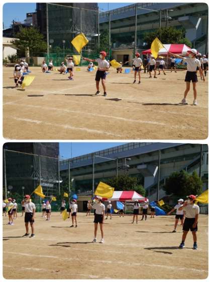 練習もあと1週間。高学年の団体演技の練習にもますます気合が入ってきました。隊形移動をよりスムーズに、みんなのフラッグの動きをびしっとそろえて・・・。どんどんレベルが上がっています。期待していてくださいね。