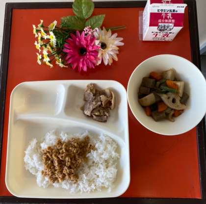 今日の給食は、豚肉のねぎ醤油焼き・ふきよせ煮・ツナ大豆そぼろ・ご飯・牛乳でした。