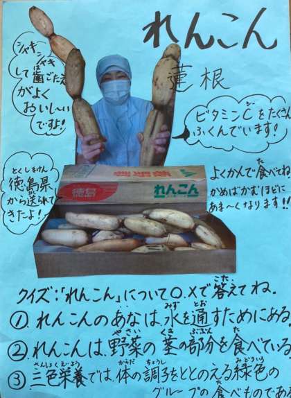 ※今日の給食クイズの答えは、(1)×、(2)○、(3)○です。レンコンの穴は水ではなく空気を通すための穴です。