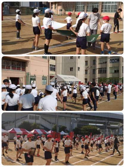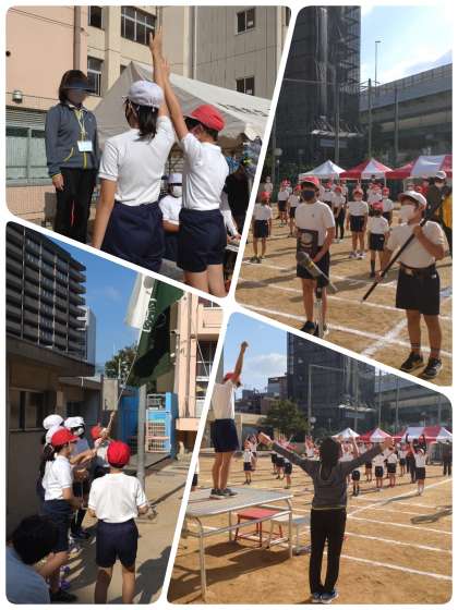 まず各学年の紅白待機テントに集まり、ファンファーレ、ピストル、司会の合図で入場しました。その後、開会の言葉、国旗・校章旗掲揚、優勝旗・準優勝盾の返還…ラジオ体操と本番通りのスケジュールで進めていきました。