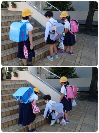 登校してきた子ども達も気づきました。すぐに集まってきて、じーっと見ながら・・・。
