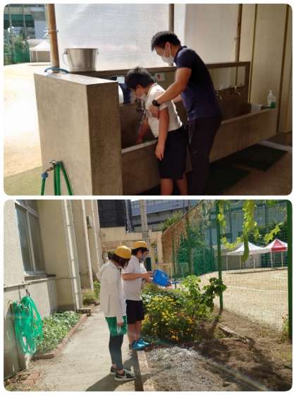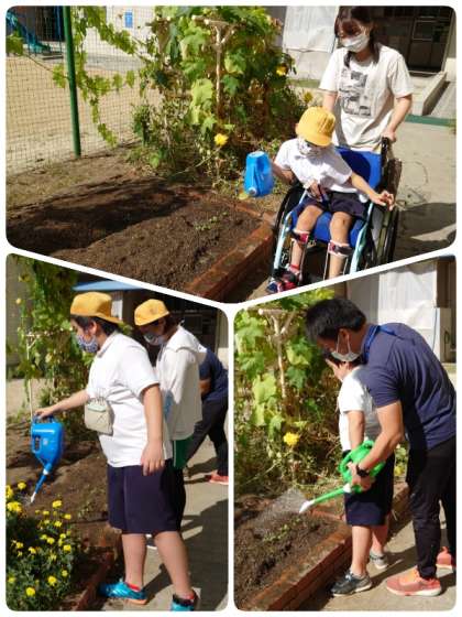 暑い中、なかよし学級の子ども達は、毎日欠かさず学習園の水やりをしています。それぞれジョウロ2回分の水やりをして、ハツカダイコンが順調に育っています。