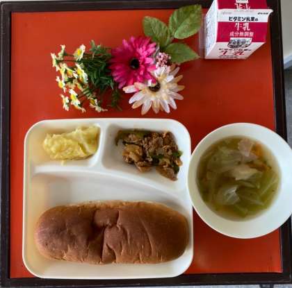 今日の給食は、豚肉と野菜のケチャップソテー・スープ・スイートポテト・黒糖パン・牛乳でした。