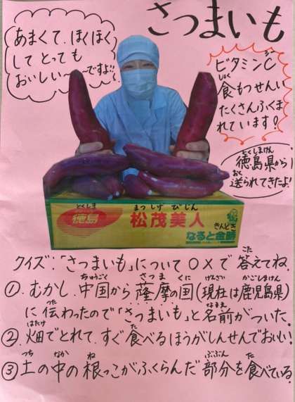 今日の給食のスイートポテトに使われたサツマイモは、徳島県で作られたものでした。学校給食では、以下の行程で作られています。