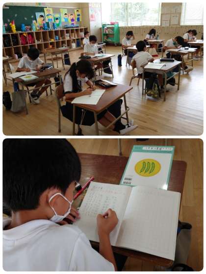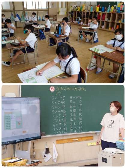 2年生は算数の学習で九九の5の段を学習していました。「五一が5、五二 10、五三 15・・・」初めはゆっくりゆっくり唱えます。ノートにも5の段をていねいに書きました。お家でもしっかり練習してくださいね。