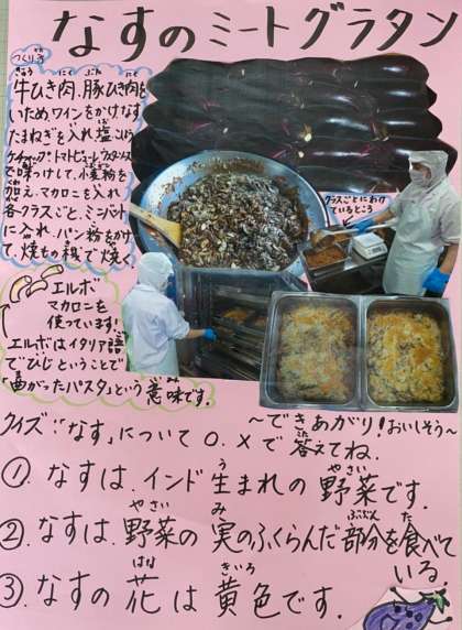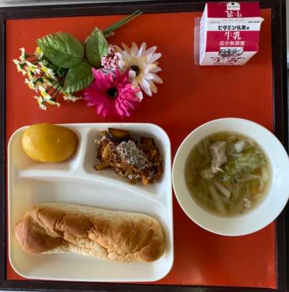 今日の給食は、なすのミートグラタン・鶏肉と野菜のスープ・黄桃(缶)・おさつパン・牛乳でした。