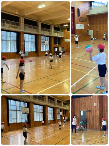 3年生の体育では、ポートボールのゲームに向けてパスの練習をしています。相手の胸の位置を狙って投げるノーバウンドパスや敵の横を通すワンバウンドパスの練習をしました。敵がいる場合に、投げ手と受け手がそれぞれパスを通しやすい位置に移動したり、受けてが手を上げて左右どちらにパスがほしいのか合図を出したりして工夫していました。