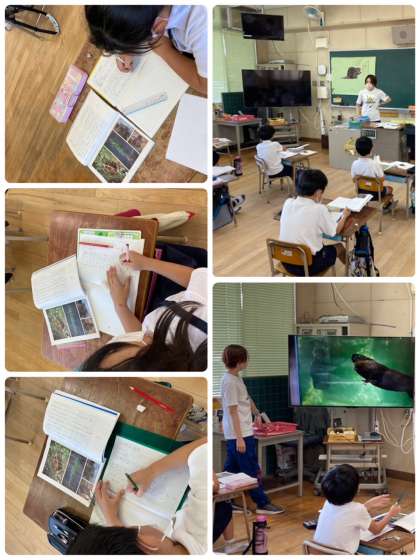 2年生の国語では、説明分の「ビーバーの大工事」を学習しています。今回は、ビーバーの秘密を見つけていました。ビーバーは、木を切り倒した後、短くしたものを持ちながら泳ぐそうです。すごいですね。子ども達は実際にビーバーが泳いでいる映像をじっくりと見ていました。