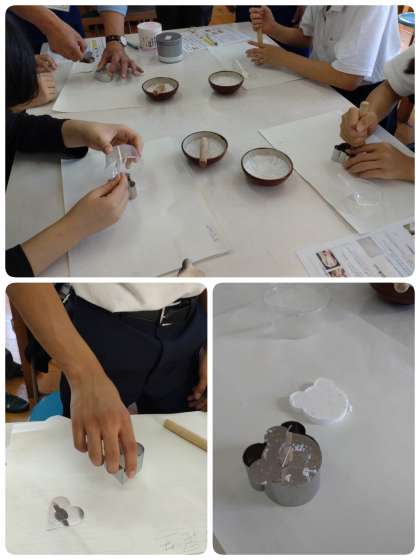 まず1人1人配られた小さなすり鉢に、重曹やクエン酸を入れてすりつぶし、今回は香りづけに紅茶の粉末を加え、最後に無水エタノールという薬品を混ぜ合わせました。それを講師の方が用意してくださったいろいろな形の金属の型枠に入れて完成させました。