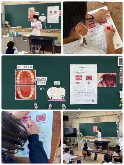歯垢がつきやすいのは歯のどのあたりなのか、写真を見て観察しワークシートに色を塗りました。今は学校で歯磨きをすることはできませんが、お家でしっかりと歯磨きをしましょう。