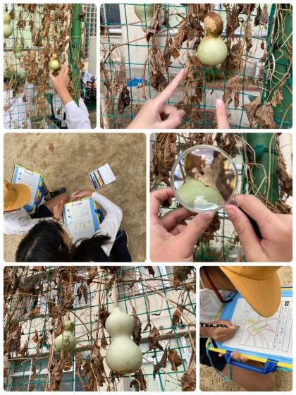 4年生は、理科の学習でヒョウタンの観察をしました。つるが枯れていたり、実に穴が空いていたりしていました。虫眼鏡を使いながらじっくり観察して記録していました。
