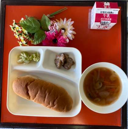 今日の給食は、鶏肉の香草焼き・ウインナーとでぼ豆のスープ・キャベツのガーリックソテー・黒糖パン・牛乳でした。