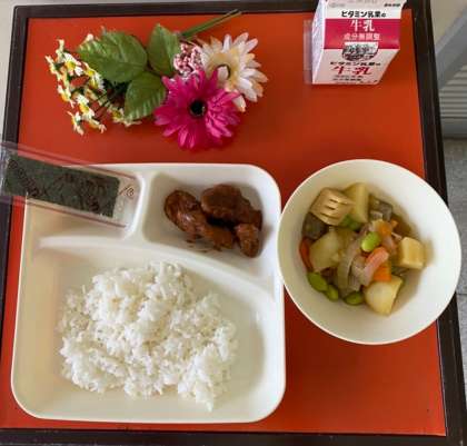 今日の給食は、味噌かつ・じゃがいもと野菜の煮物・焼きのり・ご飯・牛乳でした。