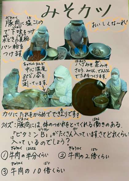 味噌かつは主に中京圏で食べられるもので、今日の給食では一口サイズのトンカツに、八丁みそ・赤みそ・砂糖・みりんにお湯を少しずつ加えて煮て水溶きデンプンでとろみをつけたものをかけて仕上げています。