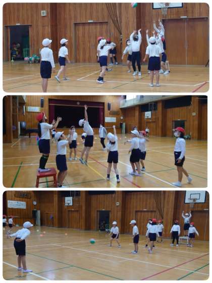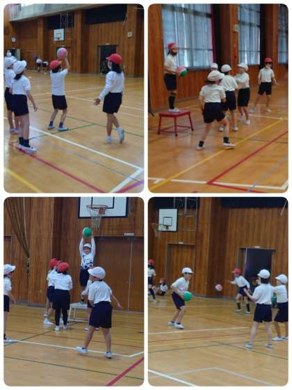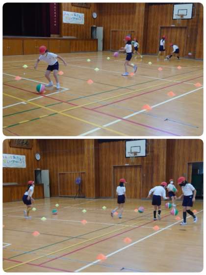 体育館から、子ども達の元気な声が聞こえてきました。3年生がポートボールのゲームを楽しんでいました。ポートボールはバスケットボールとよく似たルールのゲームです。パスを回してゴールをめざし、得点が入るたびに大喜びをしていました。ゲームをしていないチームは隣のコートで黙々とドリブルの練習です。