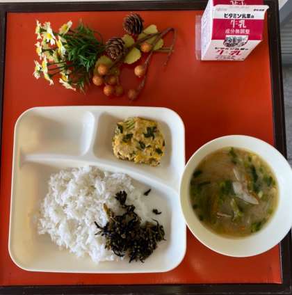 今日の給食は、千草焼き・みそ汁・ごまひじき・ご飯・牛乳でした。
