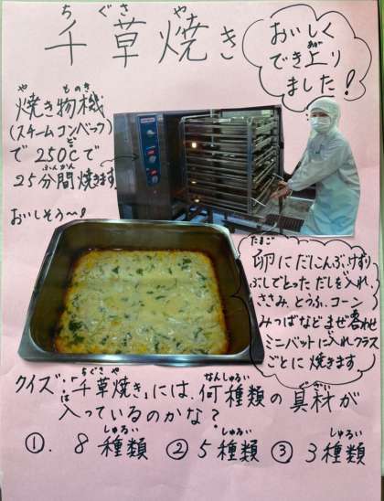 今日の給食での千草焼きには、鶏肉・とうふ・コーン・三つ葉が入っていました。