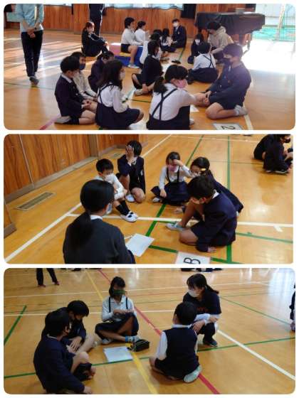 今日のクイズの答えは、「空・秋・パン・青・たこ・本」。全問正解したのは、1つの班だけでしたが、他の班もしっかり聞いて答えを考えていました。答え合わせの後「難し〜!!」と思わず声がもれていました。