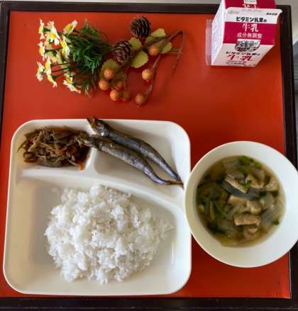 今日の給食は、焼きししゃも・五目汁・きんぴらごぼう・ご飯・牛乳でした。