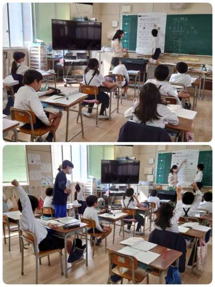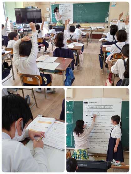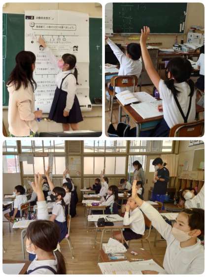3年生が、算数で「小数の大きさ」について学習していました。数直線を使っていろいろな小数の位置を考えました。友達の発表もしっかり見て聞いて自分の答えと照らし合せていました。みんなとても意欲的に取り組んでいて、自信をもって手を挙げていました。しっかり理解できたようです。