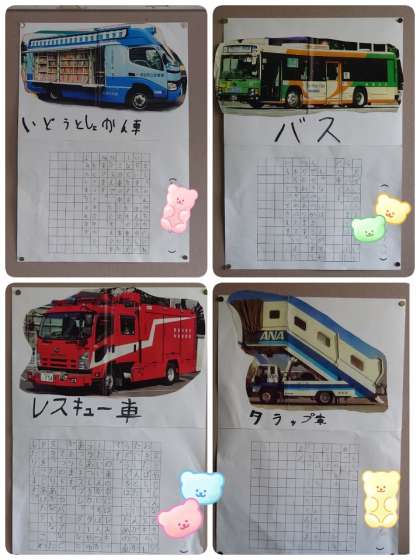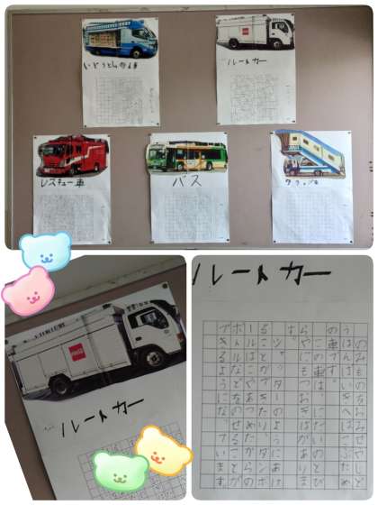 国語の「いろいろなふね」の学習の発展として、自分の好きな車について図書の本で調べたことをまとめて作文にしました。「いろいろなふね」で学習したことを活かして、説明したいことを書くことができました。字もていねいで、1年生の子ども達が一生けんめい書いたことが伝わってきます。調べた車は、レスキュー車・移動図書館・バス・タラップ車・ルートカーでした。