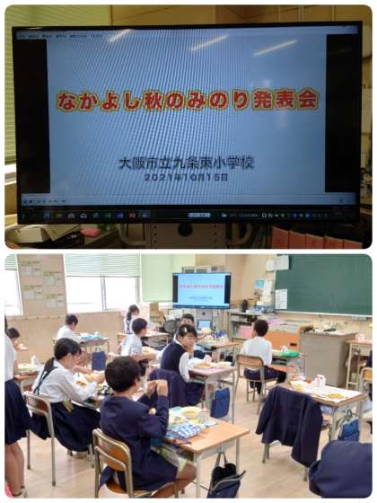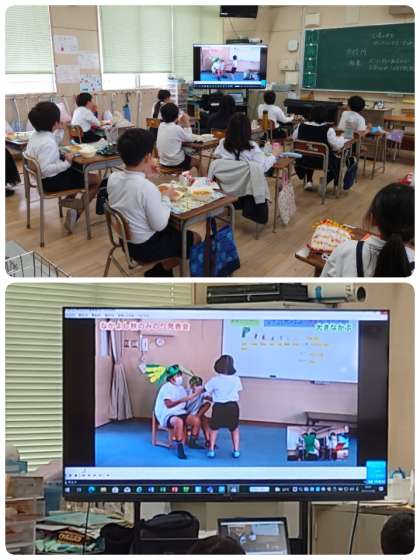 給食の時間に先日行った「なかよし秋のみのり発表会」のビデオを流しました。先生が、「お友達ががんばっているところをたくさんみつけましょうね。」と一言声をかけました。動画が始まったとたん、みんなじっと画面を見つめていました。すごく楽しそうに「大きなかぶ」を演じている様子を見て、みんなも思わず微笑んでしました。ふわっとあたたかい空気が流れた時間になりました。