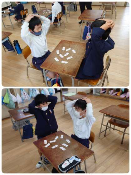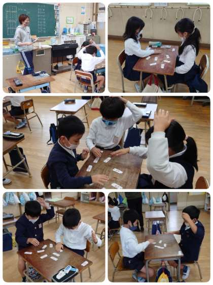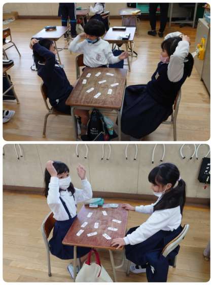 九九の習熟のために九九かるたをしていました。今日したのは7の段。かるたをする前から子ども達のワクワク度が伝わってきます。最初は先生が九九を言って、答えのカードを取りました。先生が答えを言って、式のカードをとるバージョンにも挑戦しました。頭の上に両手を置いて待っているときの子ども達の顔はいきいき、やる気満々です。子ども達のかるたは白熱の勝負となりました。