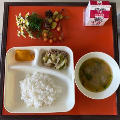 今日の給食は、豚肉とまいたけの炒め物・いわしのつみれ汁・かぼちゃういろう・ご飯・牛乳でした。