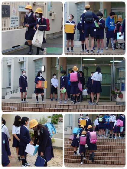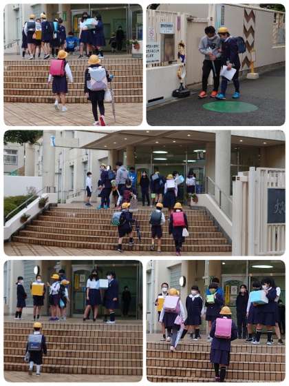今日も雨が時々パラパラ空はどんよりしていましたが、九条東小学校の玄関前は、活気がいっぱいでした。箱からカードをとる前に、しっかりと目を見てあいさつしている子もたくさんいます。運営委員の子ども達は毎朝とてもがんばっています。