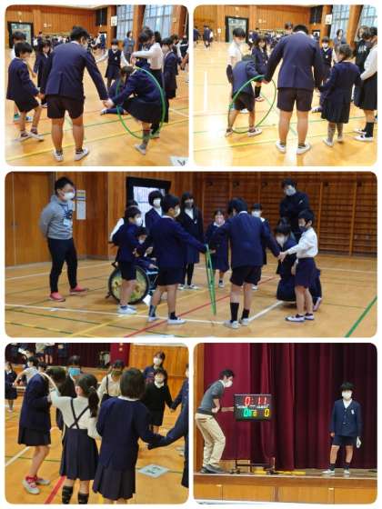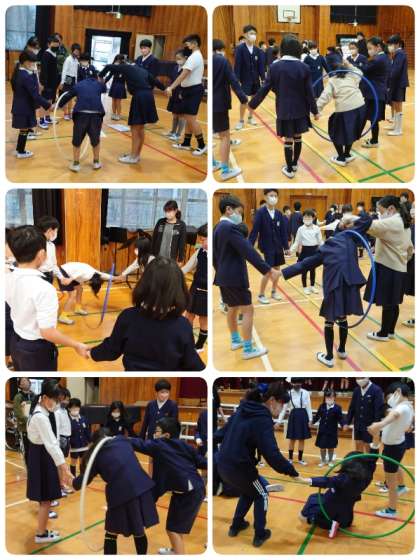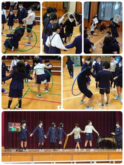円になって、フラフープを1周回していきます。1回目はたてわり班で、2回目は2つのたてわり班がチームになってリレーをしました。最後は1分以内でと時間制限付き。全ての班が協力して1分以内に1周することができました。制限があると一層盛りあがりました。今日もみんなで楽しい集会活動を実施することができました。集会活動の後、教室に戻ってから手洗い・手指消毒をしっかりしました。